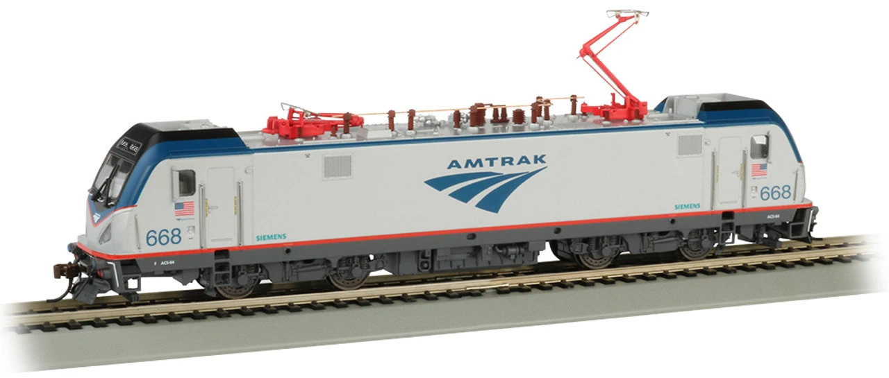 SIEMANS ACS-64 ELECTRC DCC Sound Equipped Locomotive. This DCC sound-equipped ACS-64 includes a TCS WOWSound®CD-Quality 16-bit 44,100Hz decoder with Audio Assist® for easy configuration without programming CVs and a Keep-Alive® device for uninterrupted operation, even over dirty track. The WOWSound® electric locomotive sound package includes horn, bell, cooling fan/power inverter, pantograph extension and retraction, coupler close/release, brake release and application, momentum, crew alert, grade crossing quill, departing and arriving station announcements, and more. The locomotive with all new tooling also features fully remappable light functions, die-cast frame, and selector switch for choice between rail and pantograph operation. Performs best on 22″ radius curves or greater.