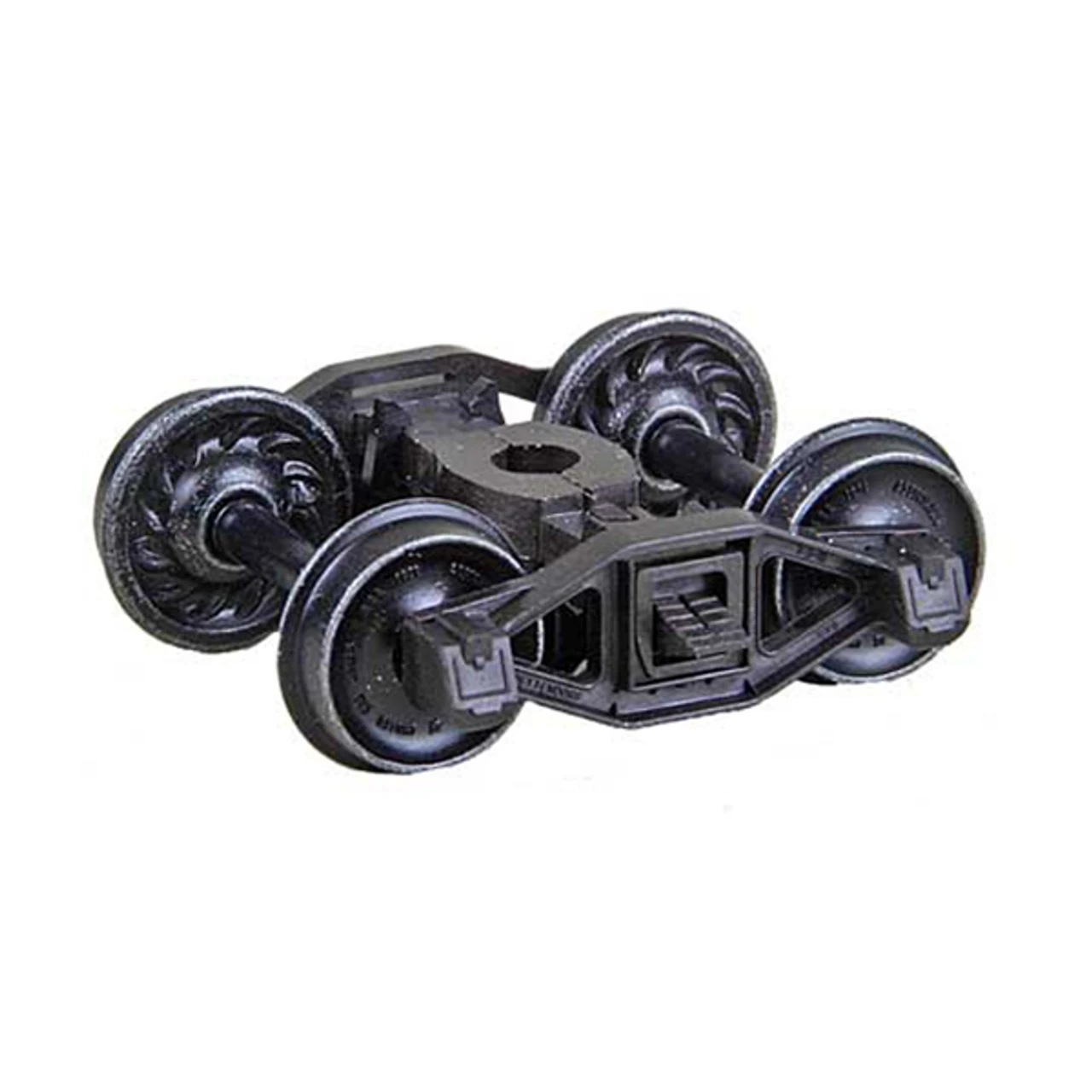Bettendorf T-Section Self Centering Caboose Trucks (Leaf Spring) “HGC” Two Piece Fully Equalized Trucks 1pr. Mounts with a #2 or 2-56 screw. Mounting Screws not Included. Truck Features • Self Centering Action – Trucks self align themselves parallel with the car for easier placement on track. • Code 110 (.110) 33″ ribbed back wheels • “HGC” Weighs nearly the same as Metal Trucks • Superior Rolling Ability. • Brake Pads • Accurate markings • Incredible detail True to prototype • Non-magnetic Metal Wheels • Highly Flexible Fully Equalized Trucks • Smooth tracking Free rolling Contoured Insulated Axles • RP-25 Free rolling wheels • Patent number 7,434,518 B2