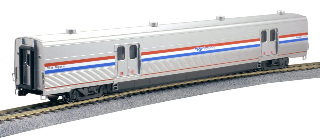 The Viewliner® II is Amtrak’s newest addition to its fleet of single-level rolling stock. Right now Amtrak is operating 55 Baggage cars in this new style, wearing a special “Phase III heritage” paint scheme that combines the classic red-white-and-blue stripes with Amtrak’s new modern logo and the phrase “Amtrak America”. While the Viewliner and Amfleet® single-level cars are typically designed for use throughout the Eastern United States on long distance trains, the new Viewliner II Baggage cars are also used on Superliner trains.