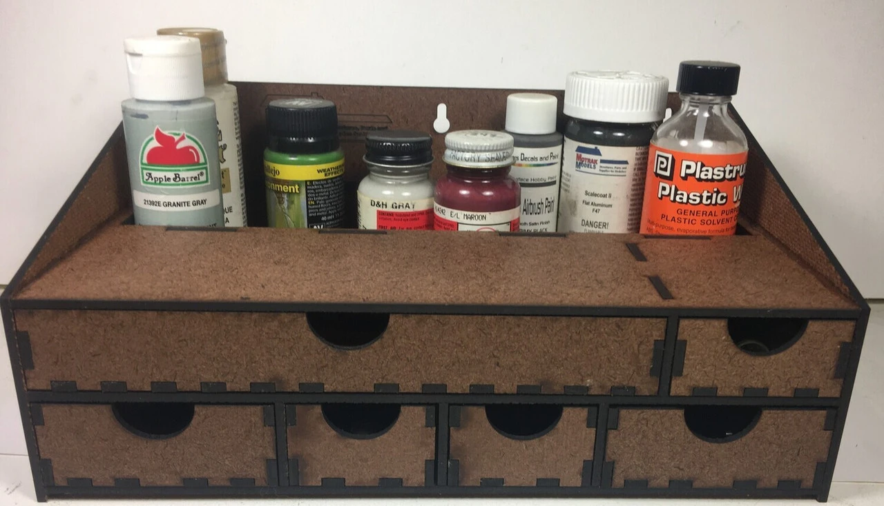 Product Details Brand: Motrak Models UPC: 50014 Manufacturer: Motrak Models Category: Masonite Products This workstation will hold different-sized paint bottles or glue bottles.