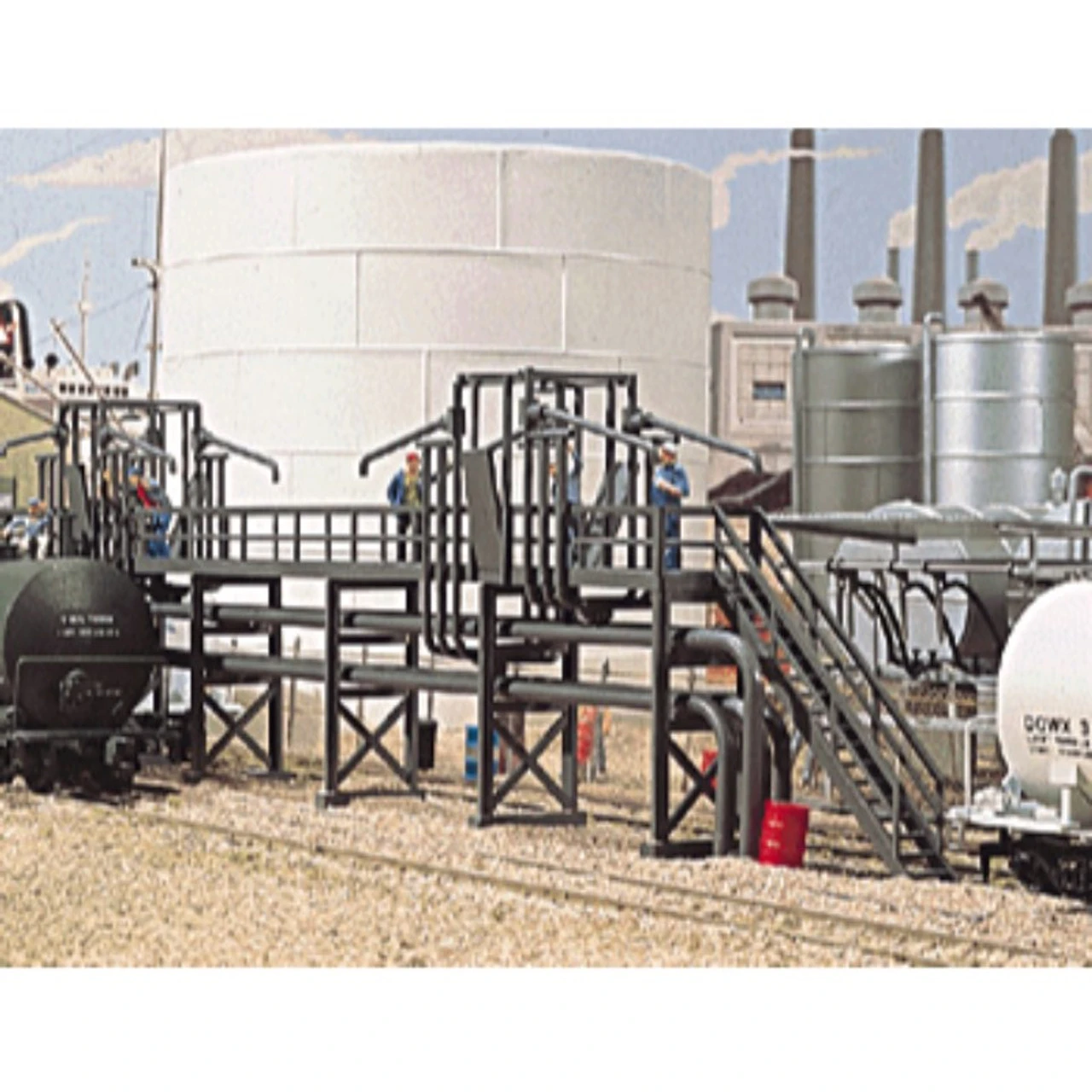 The Walthers Cornerstone HO Scale Oil Loading Platform kit simulates a typical tank car loading platform which serves two tracks. Complete with piping, nozzles, platforms and stairway, safety sign decals, nonworking light fixtures and more. The photo shows two kits combined to build a longer platform. Parts come molded in appropriate base colors. As shown the kit measures: 7 x 13/16″ 17.8 x 2.1cm Use the Oil Loading Platform at Cornerstone HO Scale industries. where cars are loaded with bulk liquids. Used for loading tank cars with bulk liquids Great for diesel-era scenes Molded in realistic color Easy to build