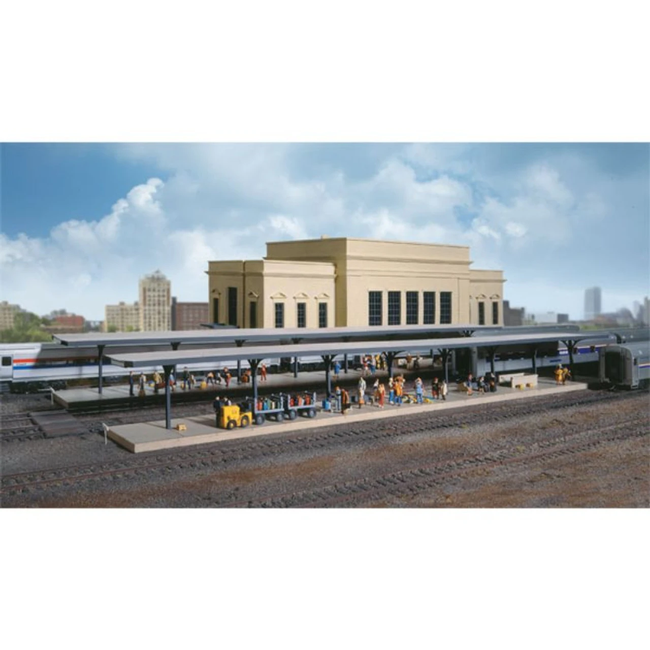 Butterfly-Style Station Platform Shelters are a great addition to the Walthers Cornerstone HO Scale Union Station kit and other railroad passenger depots. For passengers at any station the platform was the first and last stop for every passenger. Tall walkways allowed passengers fast and easy access to and from trains. The hard surface made it easy to wheel baggage and mail carts into place, as well as supplies for the diner or other cars. And since no one liked being too wet or warm, a roof provided some protection from the elements. As an alternate to costly train sheds, North American railroads tried three distinct styles of station platforms including the Busch, Umbrella and Butterfly types. Of these, the Butterfly (so named because of its up-swept, wing-shaped roof) was cheaper to build and eliminated the maintenance headaches of other designs. Providing plenty of ventilation for engine exhaust and just enough protection from the sun and rain for passengers, Butterfly platforms gained widespread popularity early in the 20th century. Building a detailed terminal scene for your passenger trains is easy with this kit. Based on the almost universal Butterfly design, platforms of this type can be found at stations in big cities and outlying suburbs where they have served passengers for many years. The kit includes parts for four complete platforms and features a modular design so you can combine multiple kits to make longer platforms. To get passengers to and from trains safely, a pair of optional underground subway stairway entrances are included to add realistic detail without a lot of work. Wooden walkway crossings between tracks, platform benches, detailed steel columns, platform signboards and realistic details are all included. Ideal for use with any steam, transition or diesel-era layout, these train depot platform shelters look great alongside Cornerstone Union Station 933-3094, sold separately, and similar station facilities. The Butterfly-Style Station Platform Shelters kit is one of a wide variety of Cornerstone HO Scale railroad structures. Great for steam or diesel-era layouts Underground stairway entrances included Modular design allows easy expansion with additional kits, sold separately Molded in appropriate colors Includes four benches, wooden cart crossings, signboards and other details Easy-to-build plastic kit